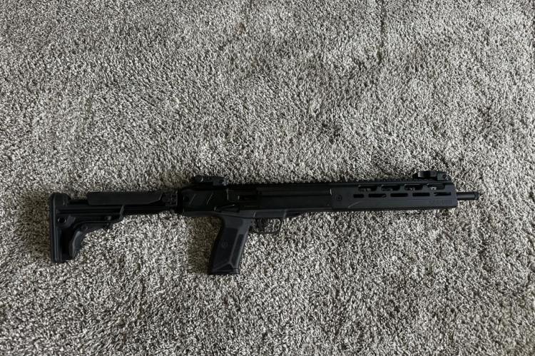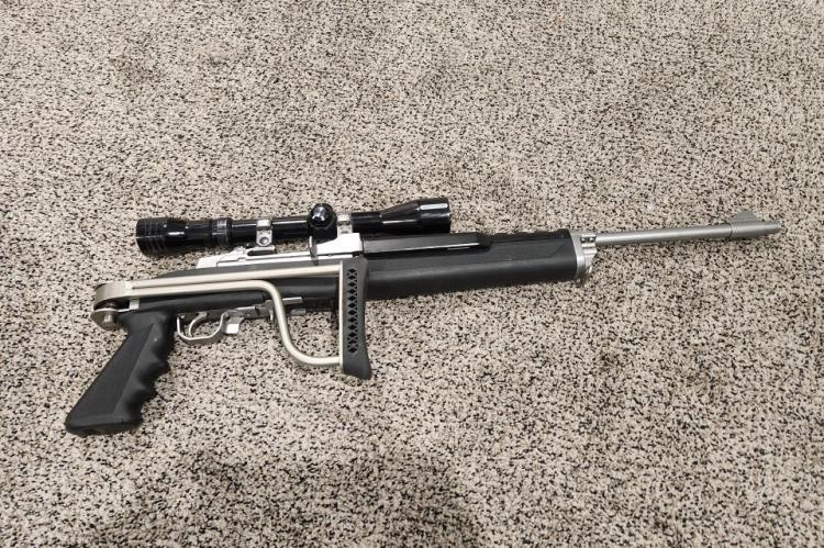 Ruger mini 14 ranch rifle in stainless steel with a side fold stock and scope.