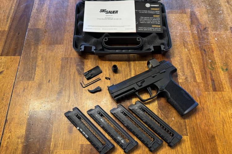 Sig Sauer p322 chambered in .22 lr. Has a Romeo zero with the shroud. Comes with 4 mags along with