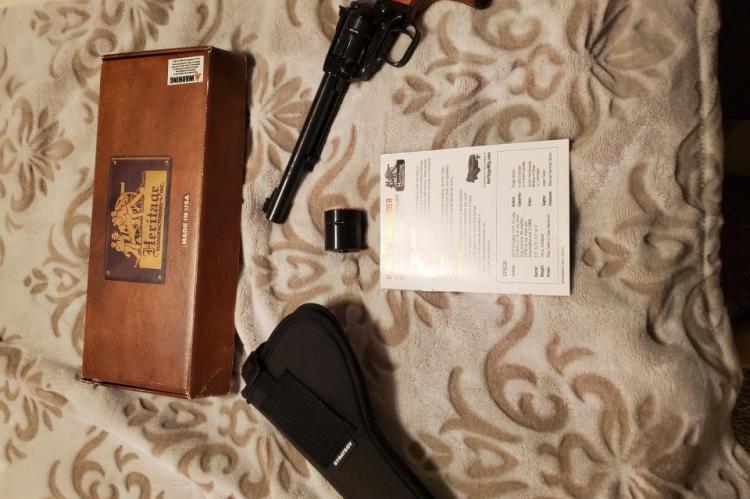Hello, selling a 6.5 inch 9 shot Heritage Rough Rider with both 22 LR and 22 WMR cylinders. Comes