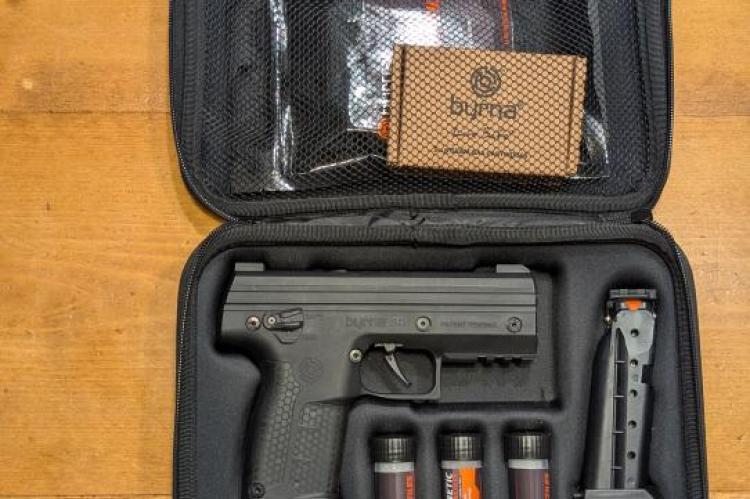 Shoots .68 caliber round kinetic and/or chemical irritant projectiles that can disable a threat from