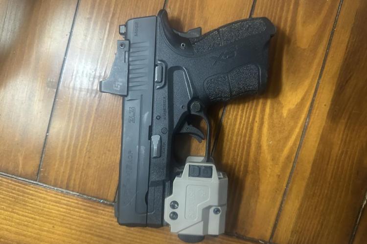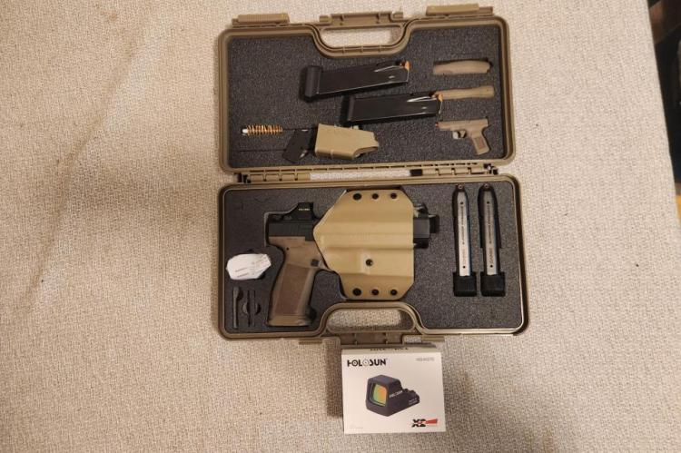 Canik METE SFX (FDE/Black) with HS407K-X2 installed and zeroed at 25 yards (6 MOA red dot). Comes