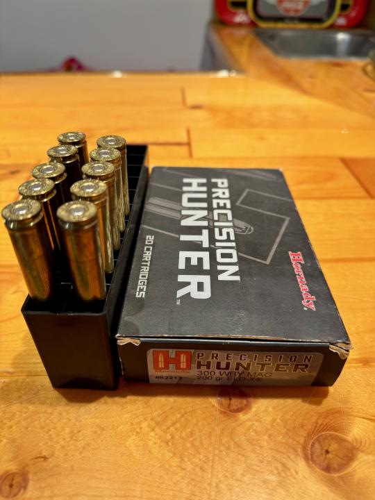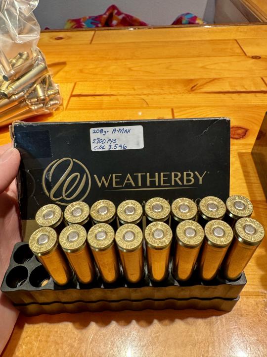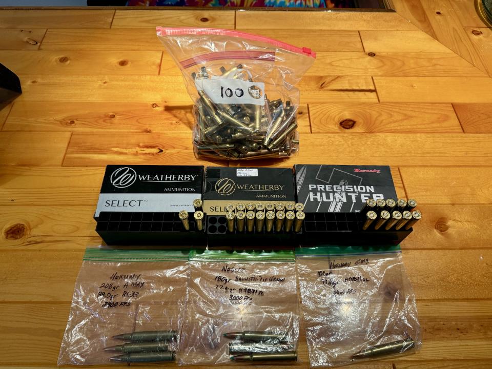 Ammo & Reloading 100 - once shot brass 10 - Factory loaded 200 grain Hornady ELD-X 16 - 208 gr. A-Max reloads 3 - Hornady Interlock 180 gr. 7 - Test reloads (trying to find a good load and never shot these ones) Total of 136 brass. Log in or register to post comments