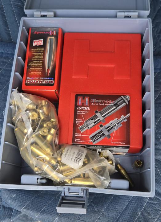 Comes with dies, new brass, bullets, and a bunch of spent brass.