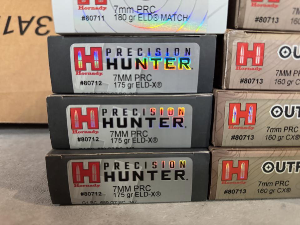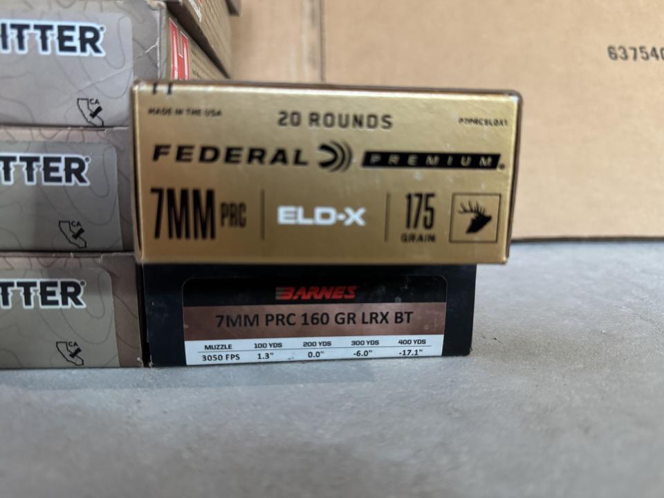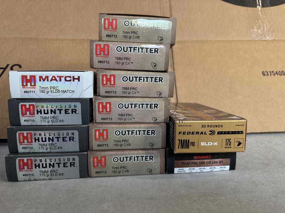 Ammo & Reloading 50 a box. No trades. 3 boxes 7mm prc 175 gr ELD-x 1 box 7mm prc 180 gr ELD- M 6 boxes 7mm prc 160 gr CX outfitter 1 box federal premium with ELD-x bullet 1 box Barnes 7mm prc 160 gr lrx-bt Log in or register to post comments