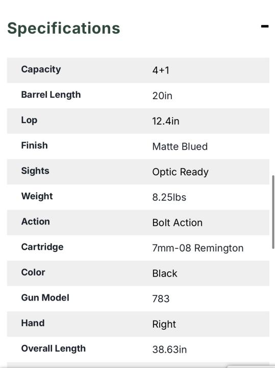 Firearms & Hunting Remington 783 7mm-08 Compact Matte Blued Bolt Action Rifle 20 inch barrel Log in or register to post comments Would you trade for 7mm prc? Would you trade for 7mm prc? Mon, 02/16/2026 - 20:15 Petejeff171 Log in or register to post comments