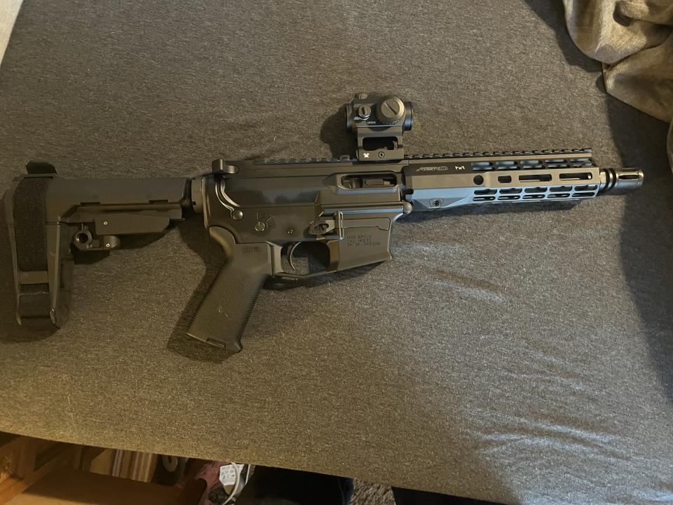 Aero Precision EPC9. Takes glock 9mm mags. The upper and lower are both factory assembled by aero precison. All I did was put them together and add a brace. I have fired about 200 rounds through it is all, it lives in the gun safe. Shoots very well, runs ball ammo and hollow points. This is one of the few AR 9 mm that has last round bolt hold open. They are relatively hard to find I don’t believe you can buy them as a completed rifle and it seems like aero precision is out of stock all the time. Not interested in any trades. Firm on price, I like it enough I’ll keep it if I can’t get my asking price. RED DOT OPTIC NOT INCLUDED. Call or text mat 201-5227
