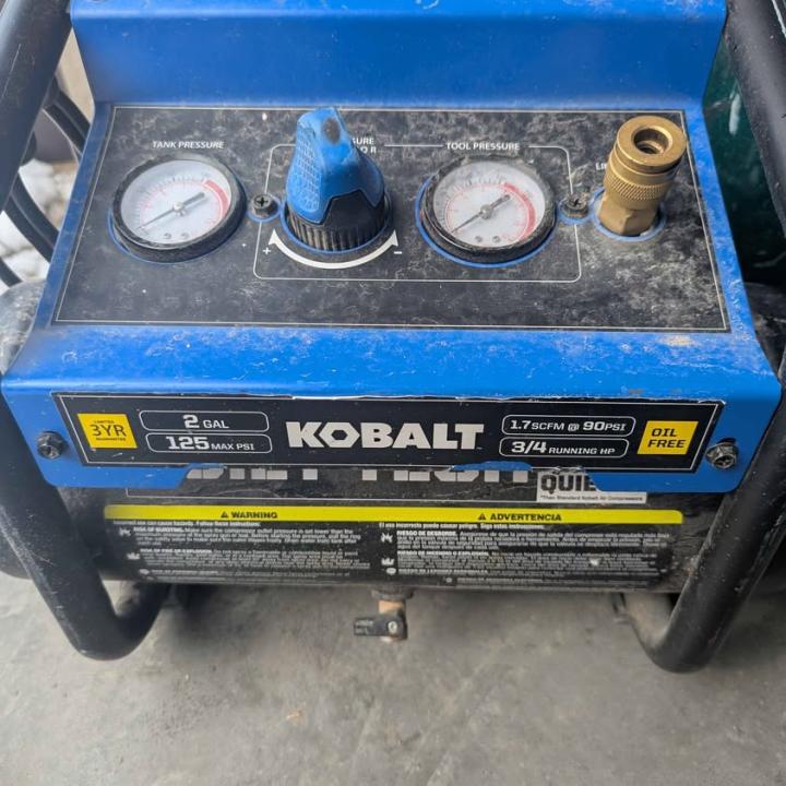 The Kobalt compressor is a 2 gallon tank with 3/4 running HP. It has 125 max PSI and is oil-free.