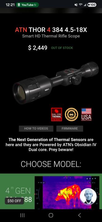 Firearms & Hunting ATN THERMAL THOR 4 SCOPE 384 4.5-18X. Great scope for night hunting. Has SD card, records videos and pics with sound. Log in or register to post comments