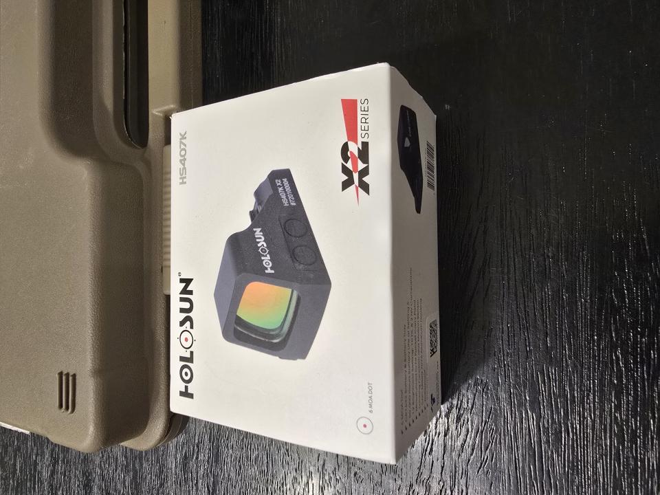 Comes with box, 5 mags (3-18 round mags and 2-20 round mags,) holster, Holosun HS407K motion sense red dot sight sighted in at 25 yards. And cleaningvand repair kit.