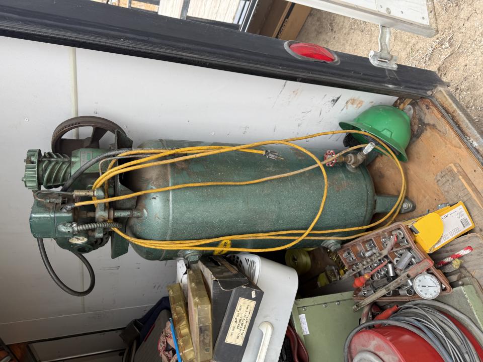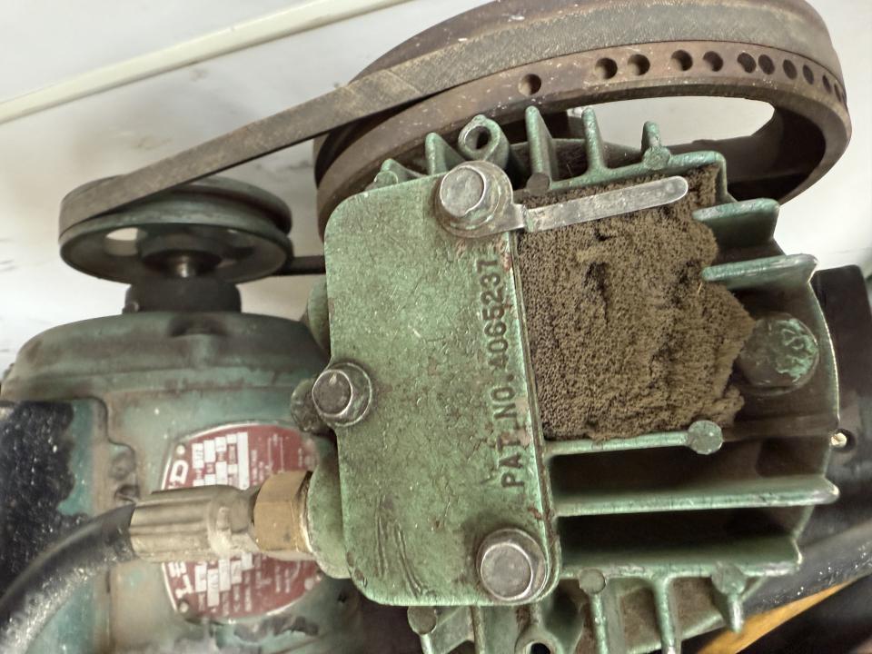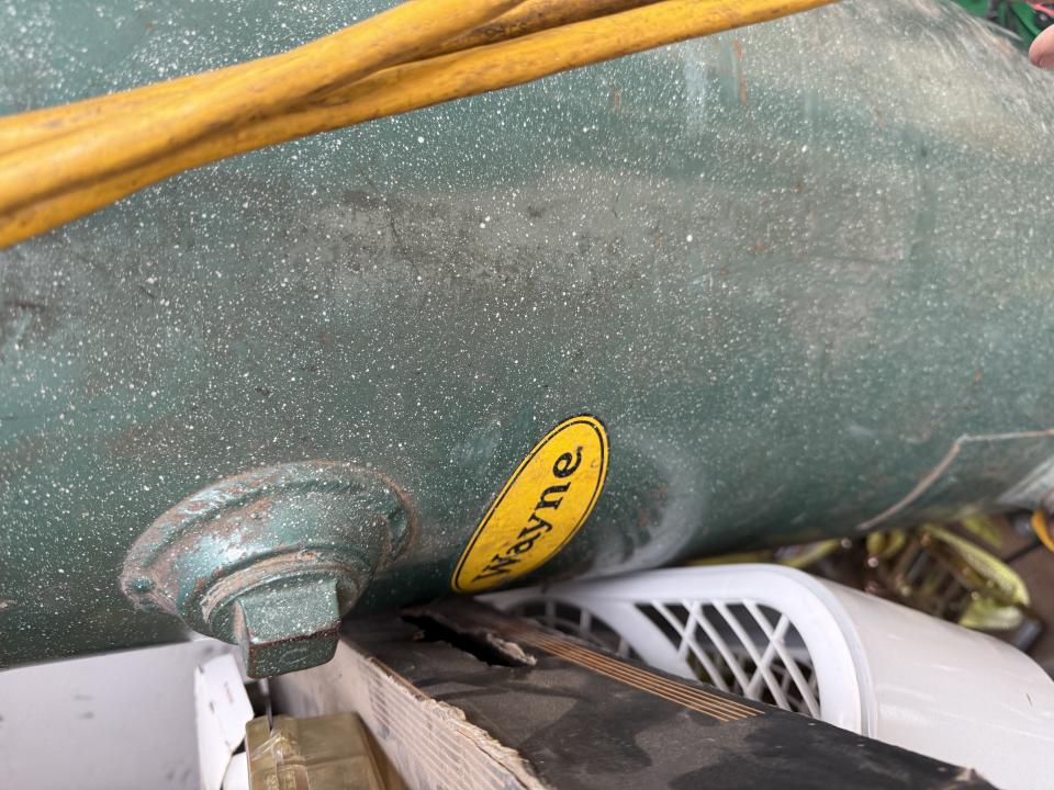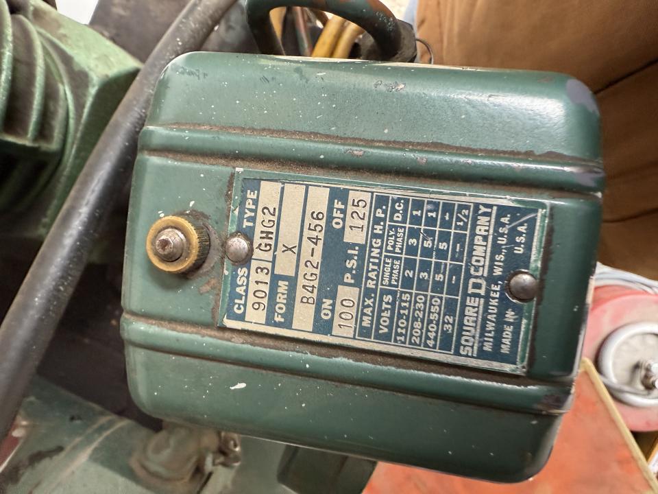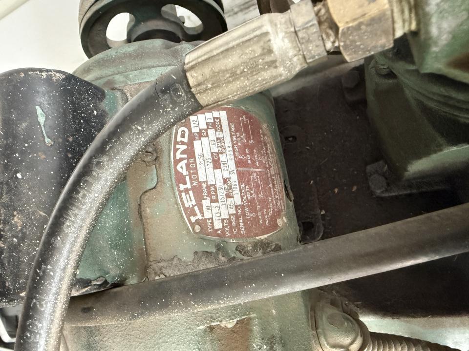 industrial vertical air compressor built with real cast iron and heavy steel. This is not a modern disposable unit. Features a Wayne vertical tank, Leland 1/2 HP electric motor (115/230V), and a Square D 9013 pressure switch set for 100–125 PSI. Belt-driven cast iron pump.