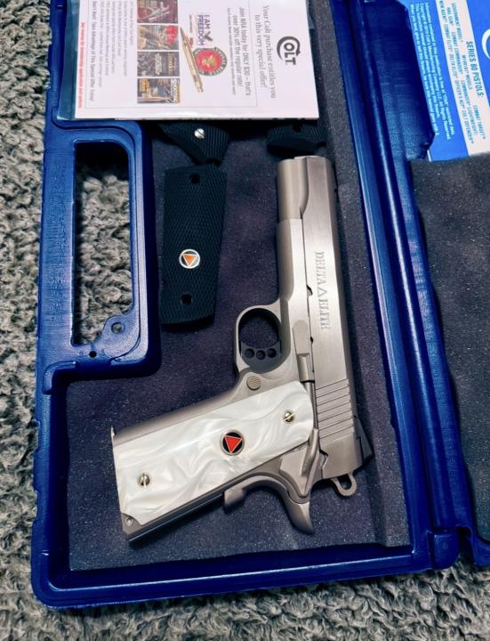 Brand new Colt Delta Elite 10mm! New custom pearl grips ($150), new rubber wrap around grips ($60), new factory grips it came with, new soft vintage leather pouch w/faux fur ($65), paid $1250 for the Delta! Original hard case with papers, $1525 value, GORGEOUS!! Will let go for firm $1300! Text for faster reply 208-two5two-1foursix3