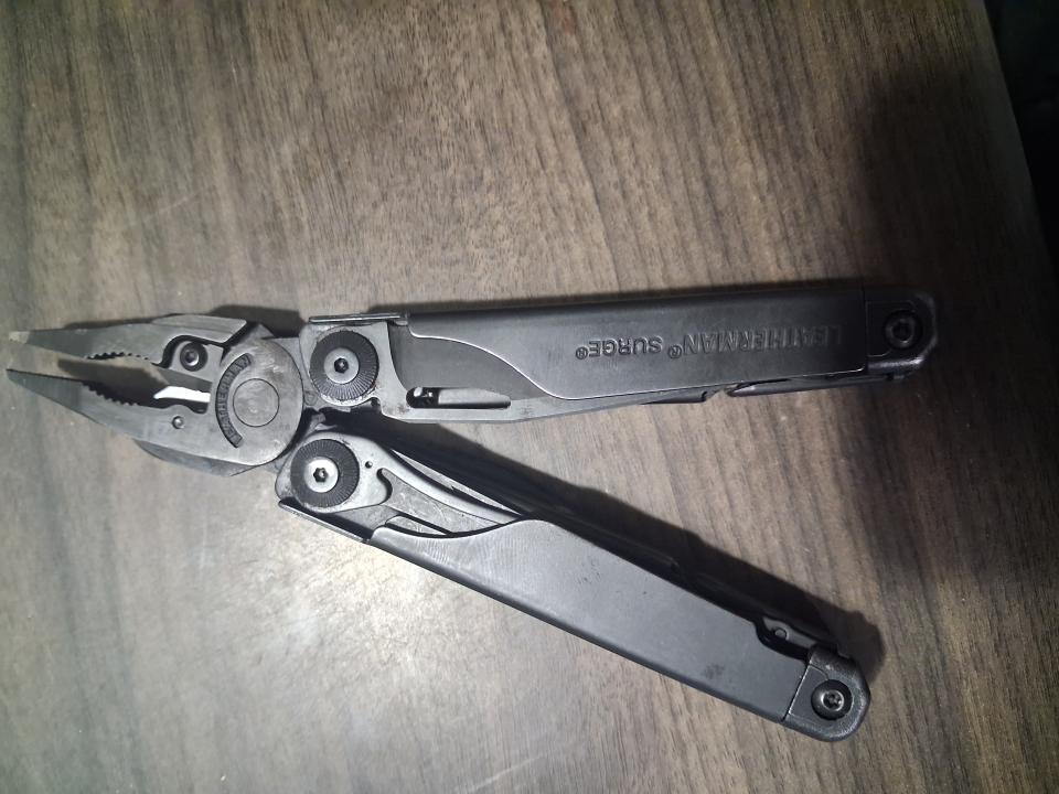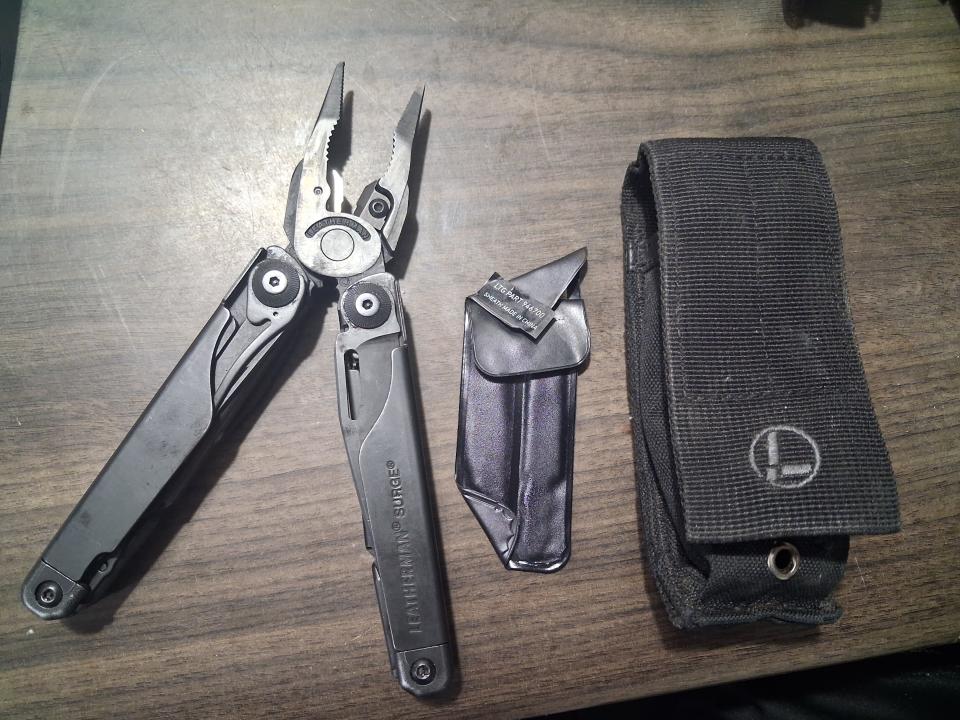 Leatherman surge great to like new condition will add to the flashlight for the same price $155 or sale all 3 for $225. comes with sheathTactical Pterodactyl Knives midsize Harpoon in a magnacut tiger striped blade finish with micarta scales. Desert multicam sheath. Sheath has a slight Crack has been there for awhile but knife retention is solid. Knife needs a spa bath and sharpened Frankie at TPK has a unlimited lifetime transferable warranty. Breads are from gorkknot (orange micafta) and wiscoworx (ivory fire) that glows.