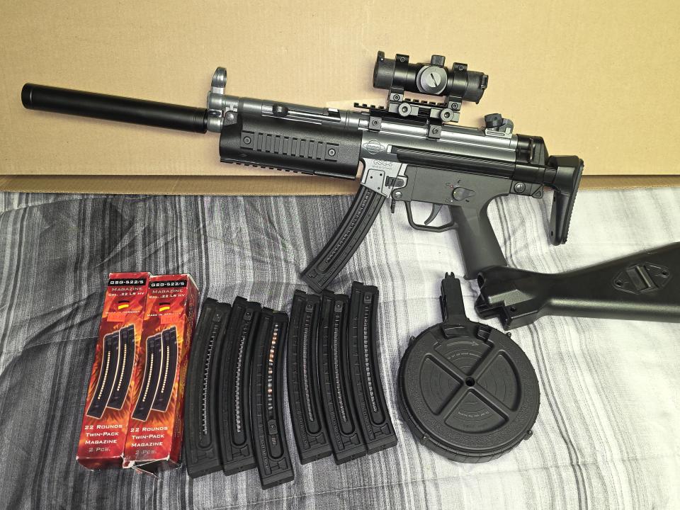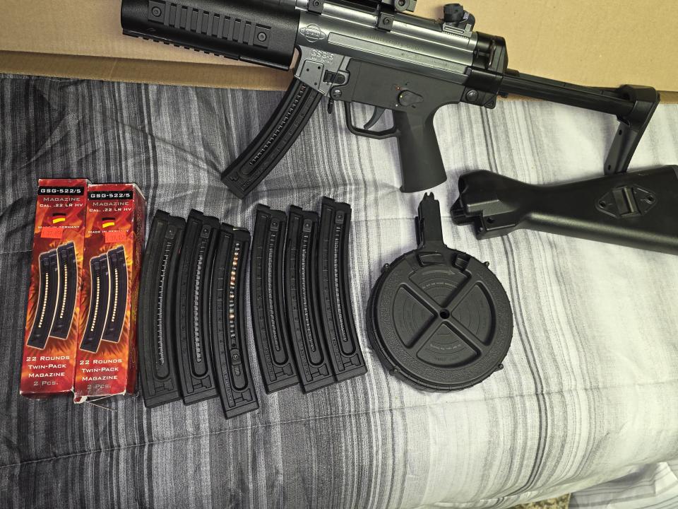 GSG-5-22lr 1st Anniversary edition. Which are not made anymore. This was the style gsg had to change due to a lawsuit by HK for it being too similar to mp5. Comes with original buttstock as well as an adjustable one that's on it. Front grip with rails was also added as well as top rail for an optic. It comes with the redot sight that's currently on it. Comes with 11-22 round mags, and 1-110 round drum. Lots of fun. Just don't ever shoot it anymore due to kids being grown up. I will thrown in 500 rounds of 22lr. Text is best. Will not respond on here. Located in idaho falls. 208-681-766five. Asking 600 cash obo. Mags and ammo alone are worth 300. Might be open to trades of other guns and ammo. Ignorant low ball offers will be ignored.