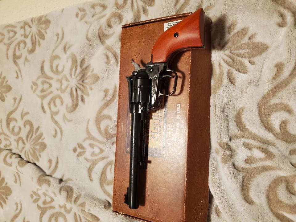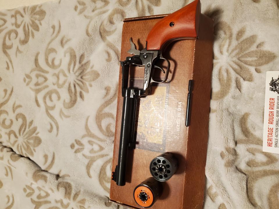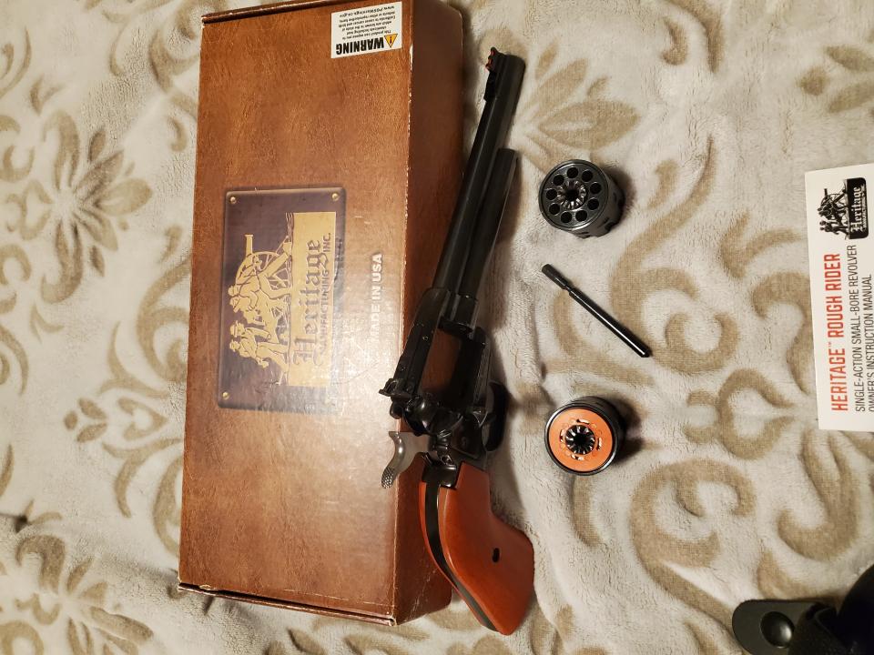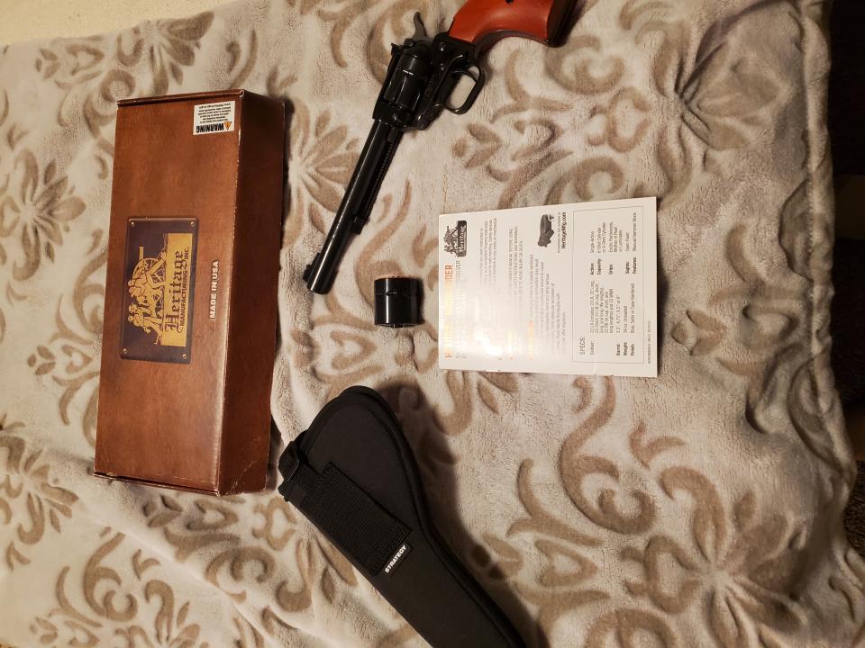 Hello, selling a 6.5 inch 9 shot Heritage Rough Rider with both 22 LR and 22 WMR cylinders. Comes with original box and aftermarket holster.