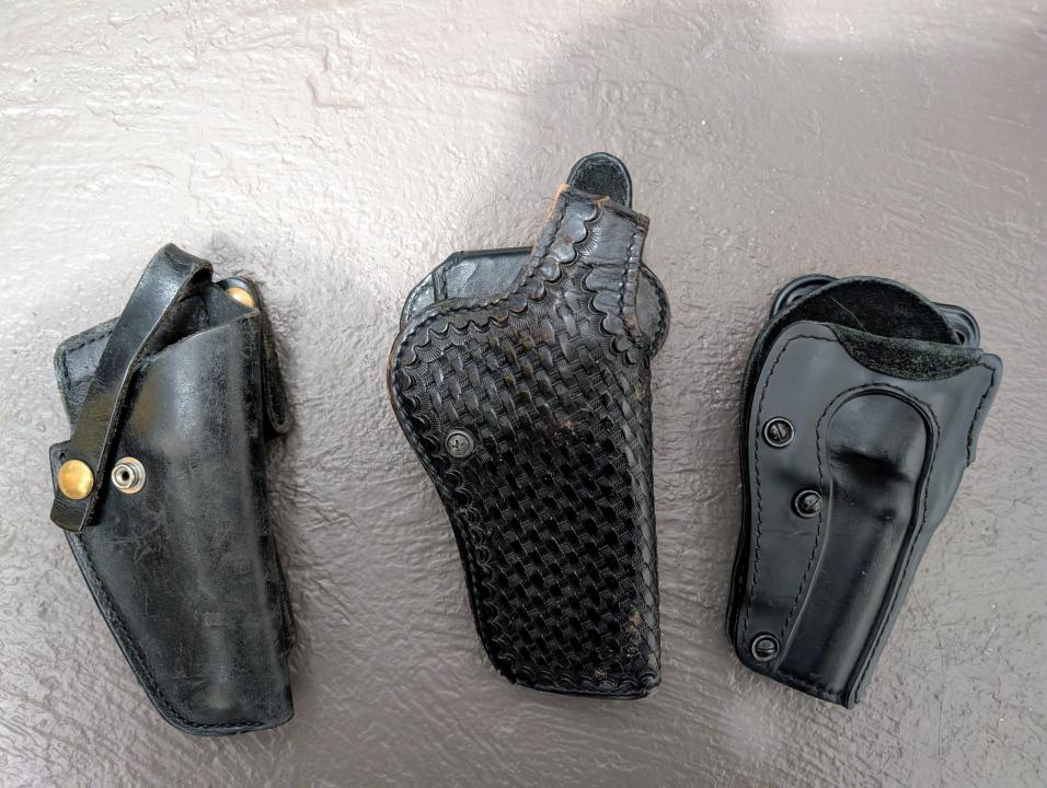 I have lots of holsters accumulated for the same gun and am looking to swap. All 3 are for a S&W 4 inch medium frame but will fit other revolvers of the same size. 2 vintage leather holsters and a newer Safariland holster.