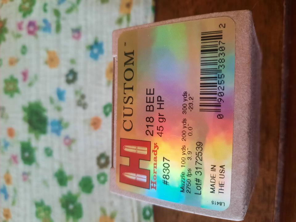 Ammo & Reloading I am selling some Hornady 218 Bee 45 Grain HP ammo. I have 3 available price is per box. Photo ID will be required to purchase. There will be no sale to people that are not old enough to purchase ammunition. Log in or register to post comments