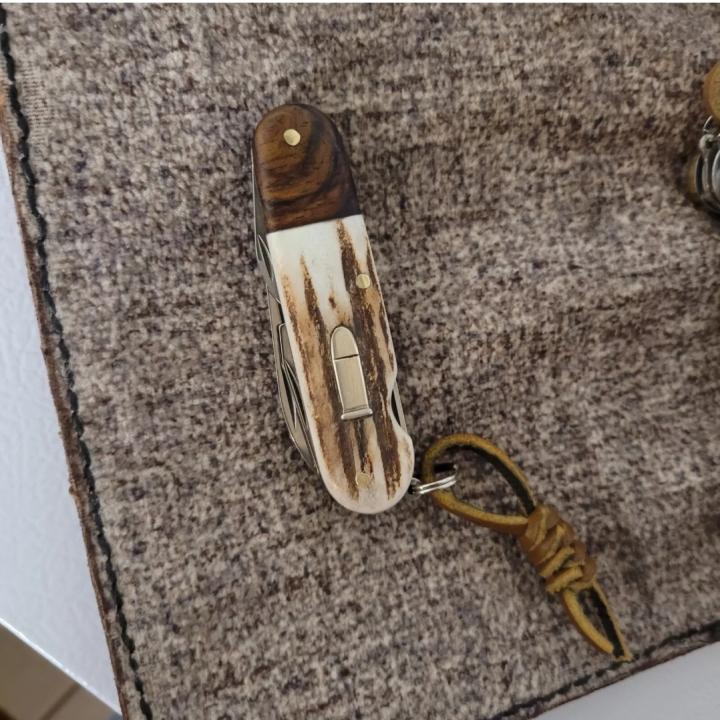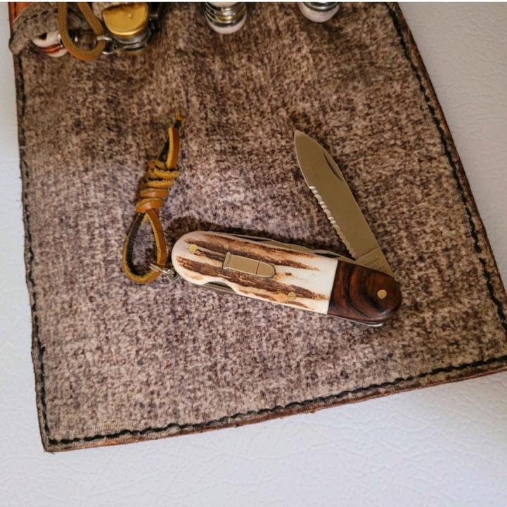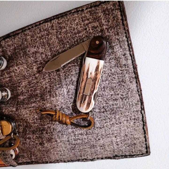 The knife's opening mechanism is an open sesame, and it comes with four blades including a punch, locking flathead driver, phillips screwdriver, bottle opener, and nail file. The slipjoint lock type ensures safety during use. The handle is made of stag/wood, providing a comfortable grip. This custom original knife is a must-have for any collector or outdoor enthusiast.