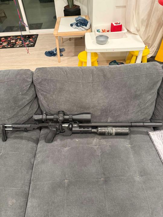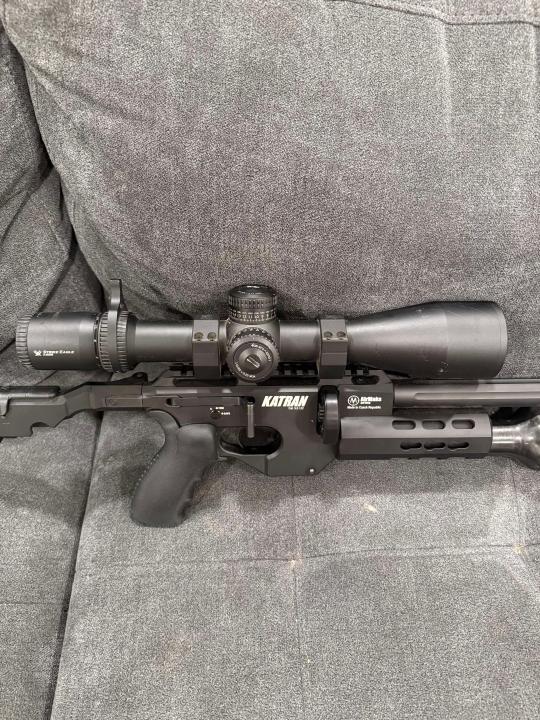 Firearms & Hunting Katran 22cal air rifle, with an air rifle suppressor can sell with or without the scope 800$ for the rifle 1200$ together. Thought I’d shoot it more, but just sits in the safe. Log in or register to post comments