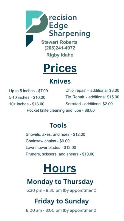 Knives Precision Edge Sharpening is here to help with all your sharpening needs. Were located in Rigby Idaho and are ready to help bring those edges back to life. Prices and hours are in photo. Call or text 208-241-4972 to get your sharpening scheduled. Log in or register to post comments