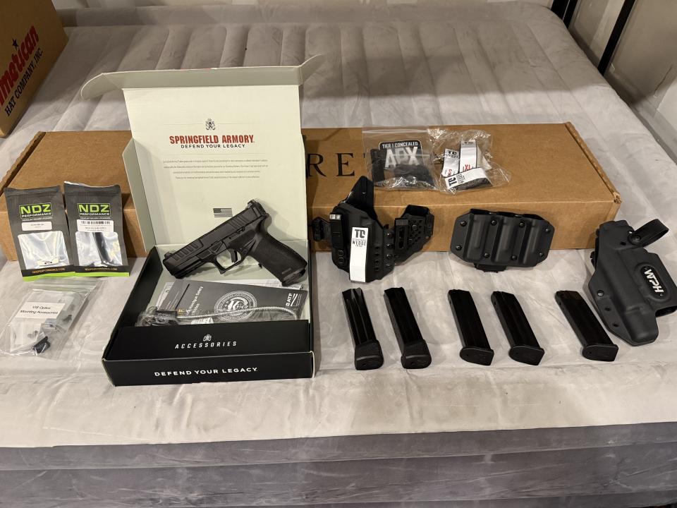Comes with: 6 mags. Tier 1 AIWB holster, WTP Level 2 duty holster w blade tech belt clip, mag holder w blade tech belt clip. NDZ tungsten guide rod (installed) NDZ mag release (not installed).