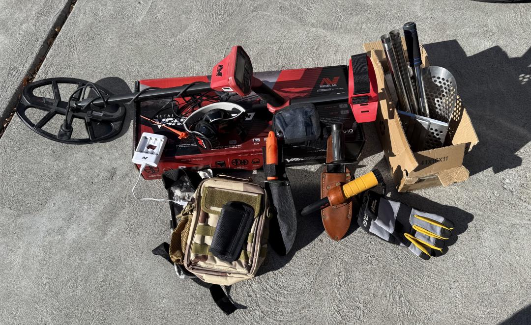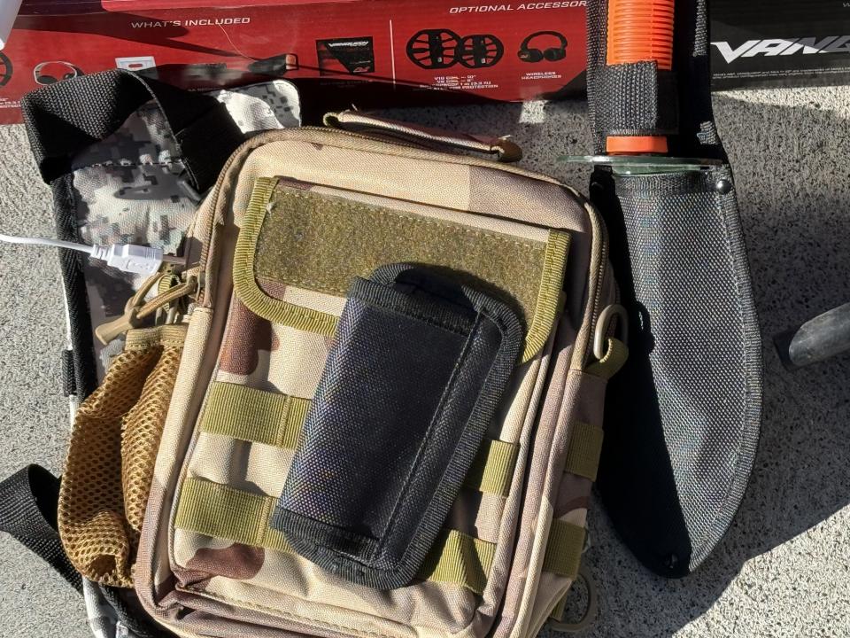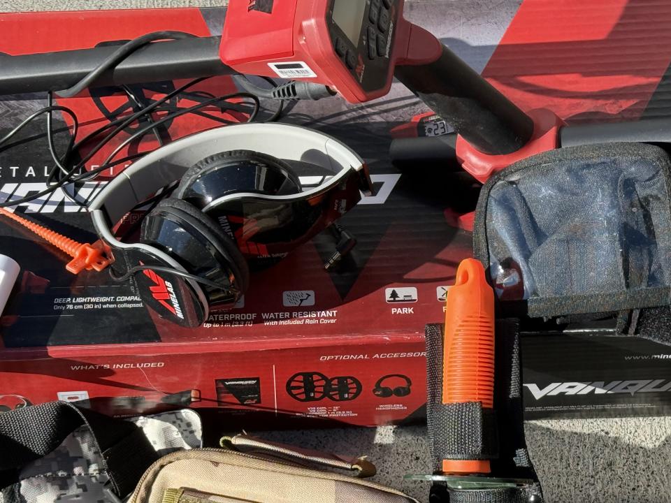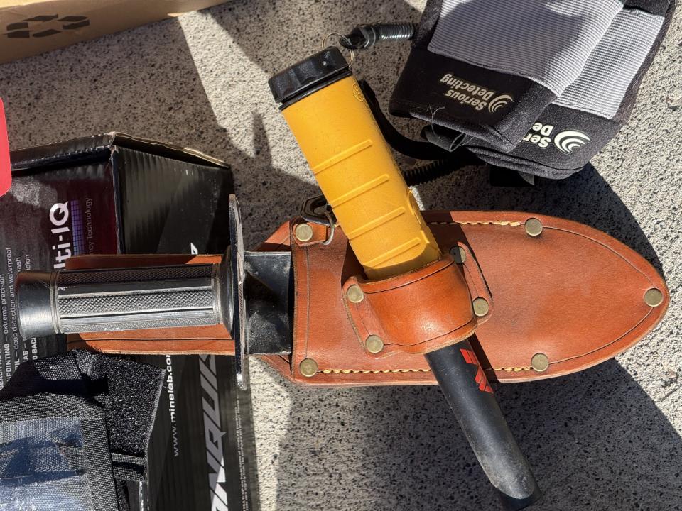Minelab Vanquish 540 metal detector in great condition, plus Minelab pinpointer and a full accessory bundle. Includes sand scoops, shovels, digging tools, leather holsters, finds pouch, and extra gear — over $1,000 in accessories if bought separately.