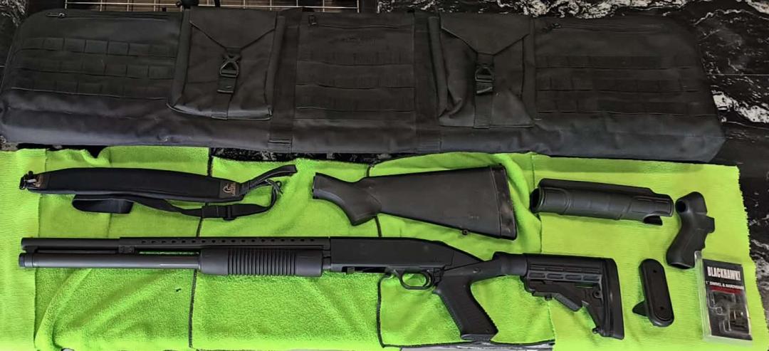 Mossberg 500 12 Guage shotgun. Comes with Carrington case, tactical adjustable stock, interchangeable pistol grip, original stock, tactical pump, and shoulder strap and hardware.