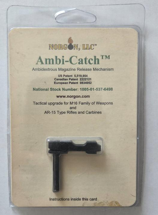 Firearms & Hunting This ambidextrous magazine release made by Norgon is for 5.56 pattern AR rifles. https://www.norgon.com/Ambi-Catch_for_M16_M4_AR-15_and_Colt_9mm_Carbine $100 shipped or local pick up Log in or register to post comments