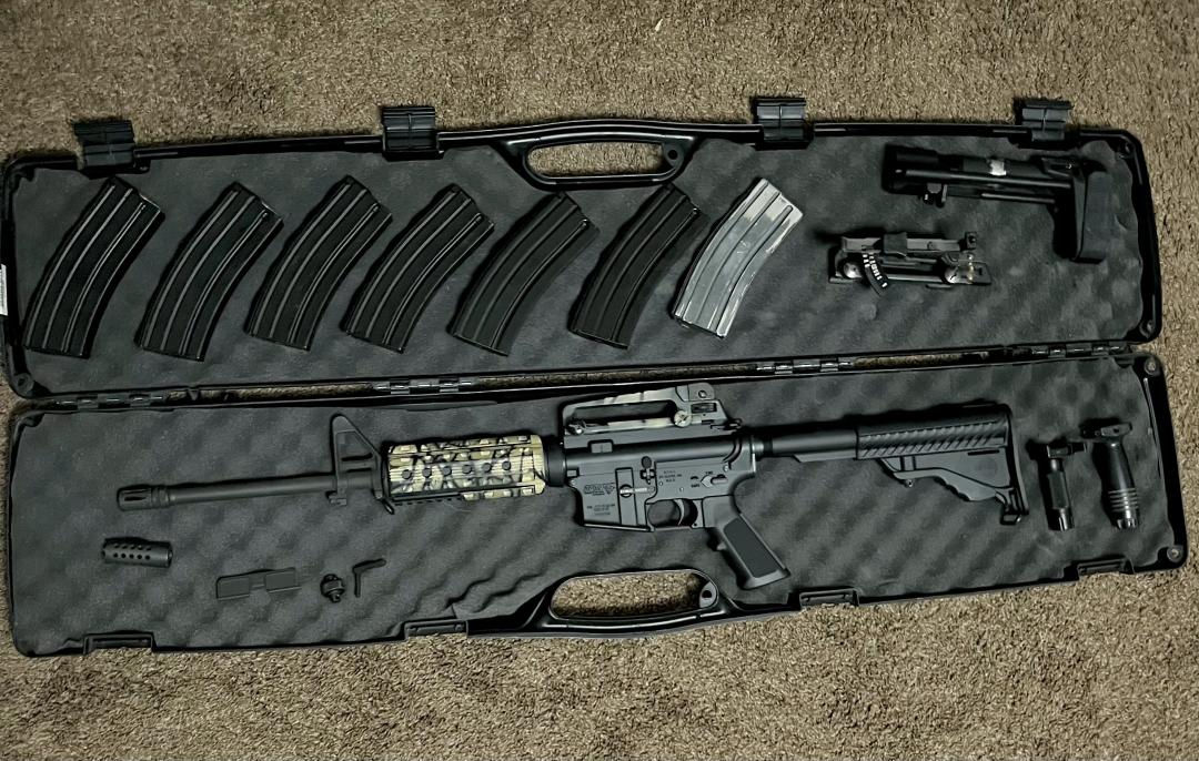 Collapsible buttstock, rubber rail covers (key-mod rail system upper), and two sets of iron sights. Comes with 7 mags, 6 of which are steel HK mags made to never jam. Also comes with an additional muzzle break, buttstock, ejection port cover, M203 grenade launcher sights, 2 vertical grips, the gun case and approximately 180 rounds 5.56.