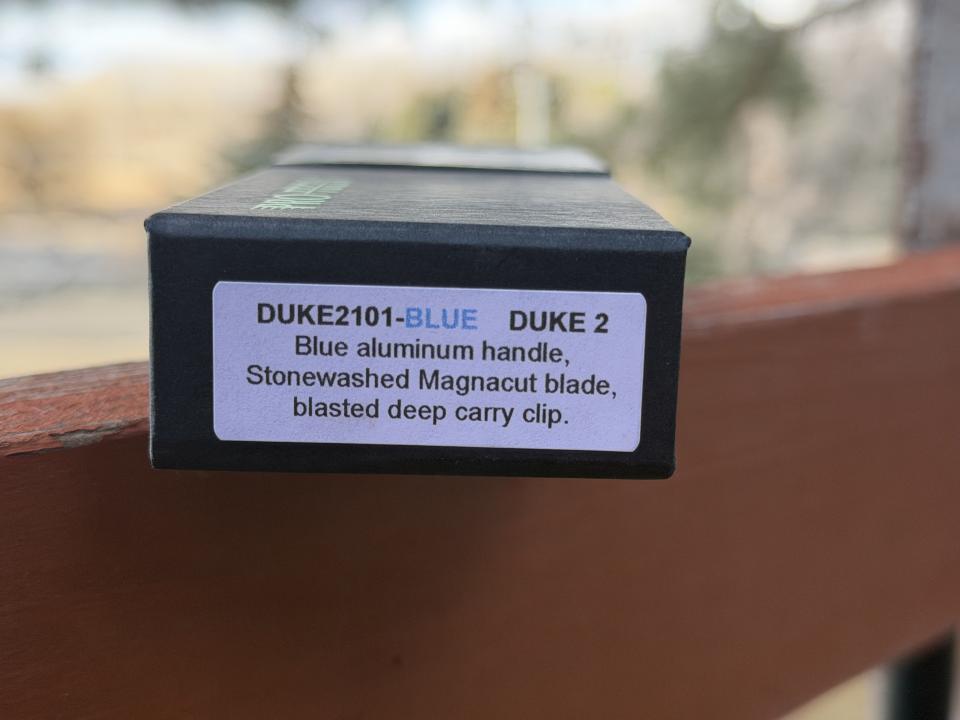 New in box, Duke 2 in blue aluminum handle, stonewash MagnaCut blade, blasted hardware, blasted deep carry clip.