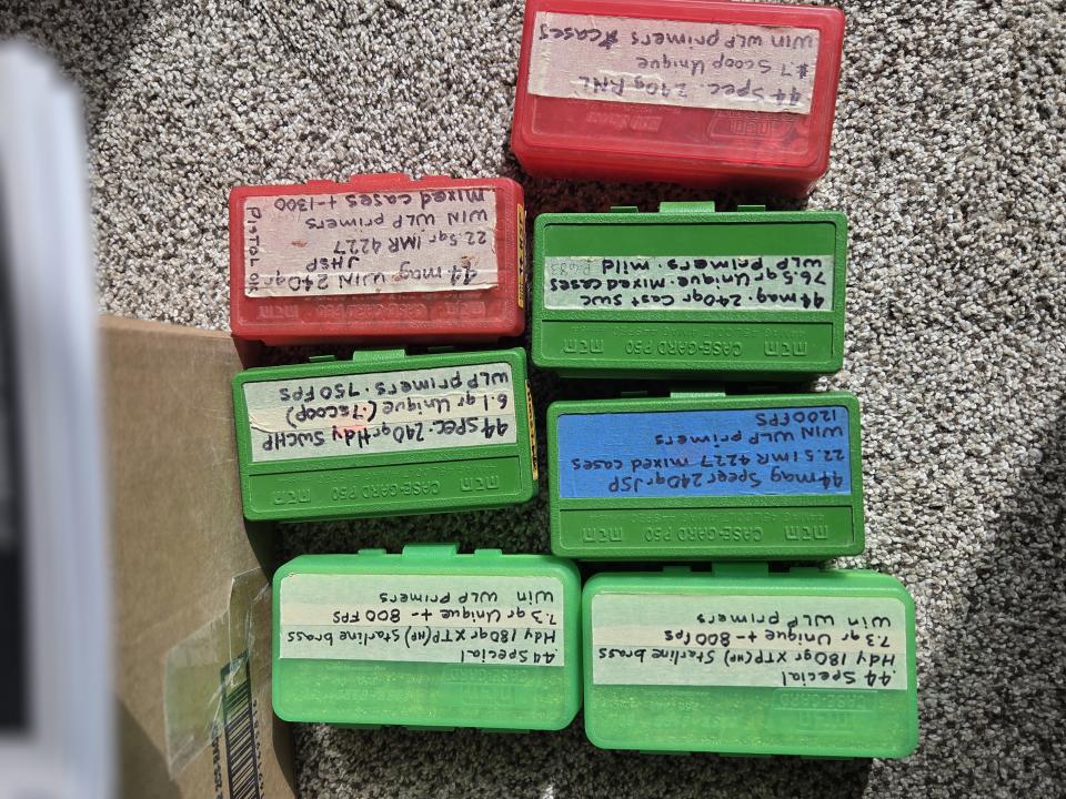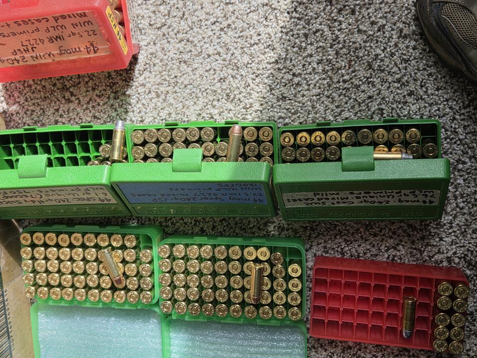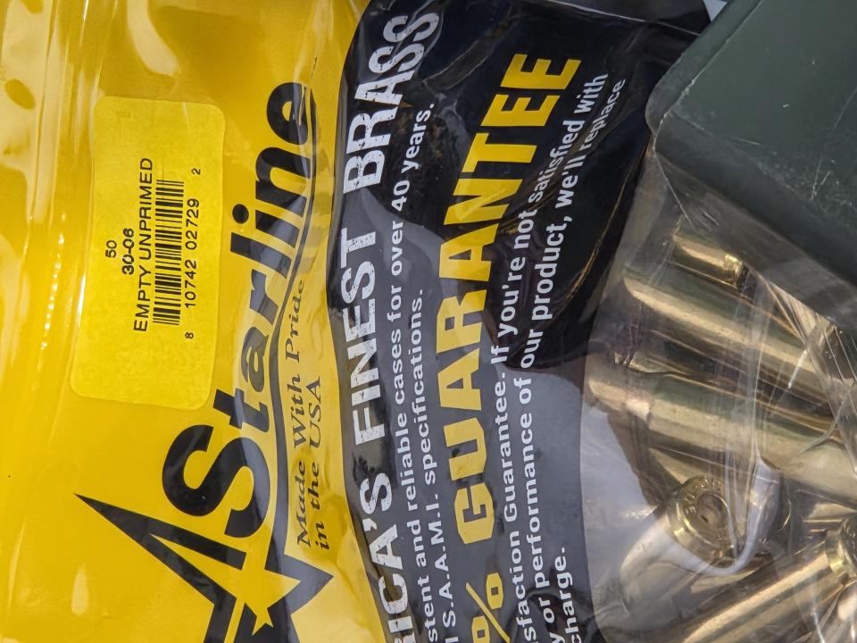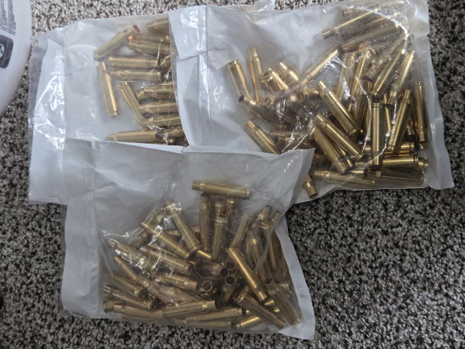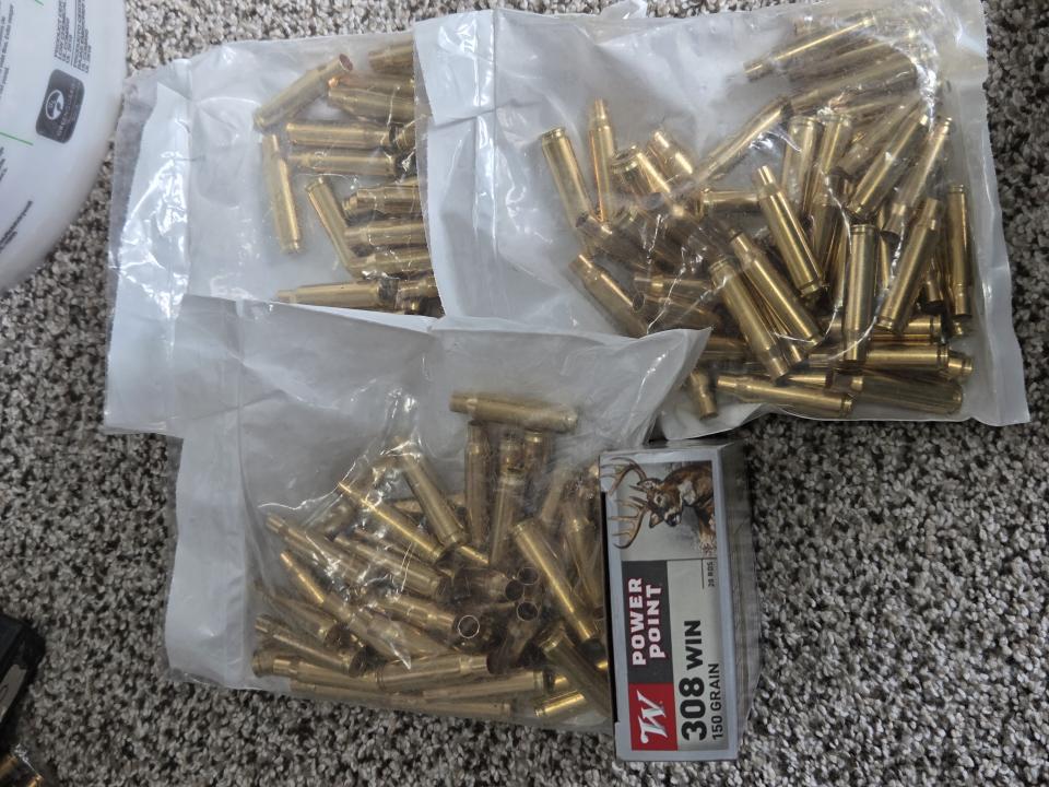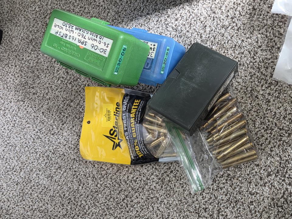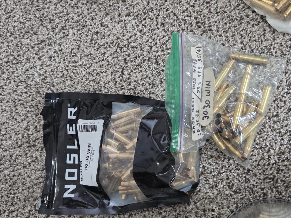 30-30 Nosler brass, Starline 308 brass and full box of Winchester .308 150 gr PowerPoint ammo, Starline 30-06 brass and ammo, some fired stuff also.