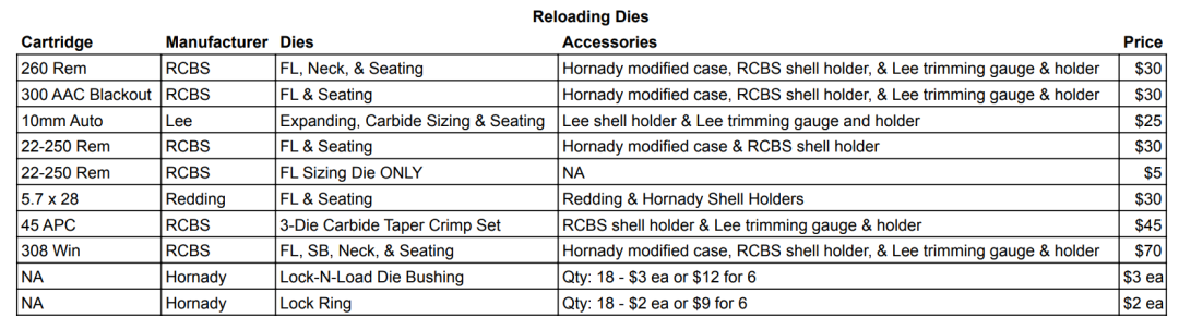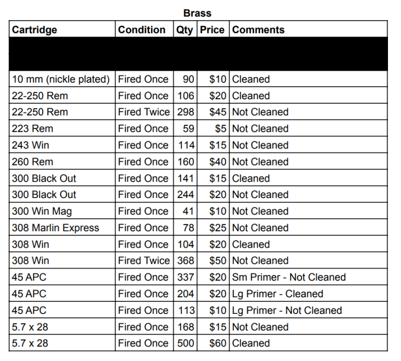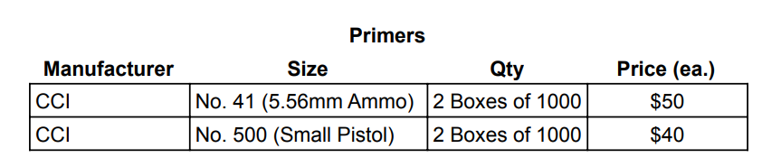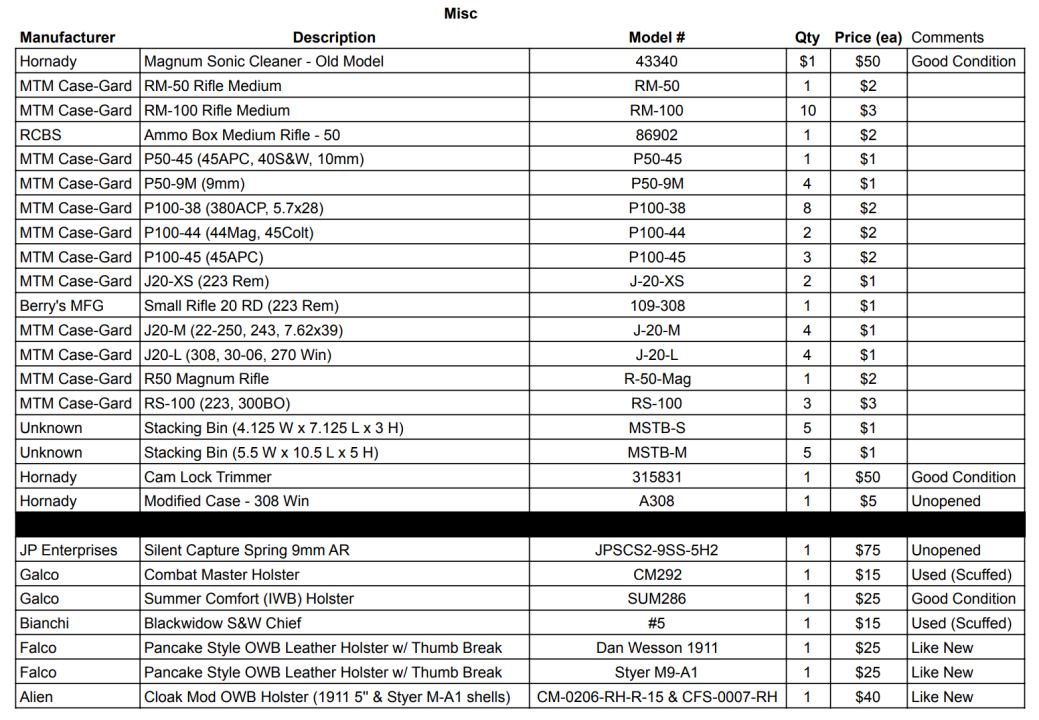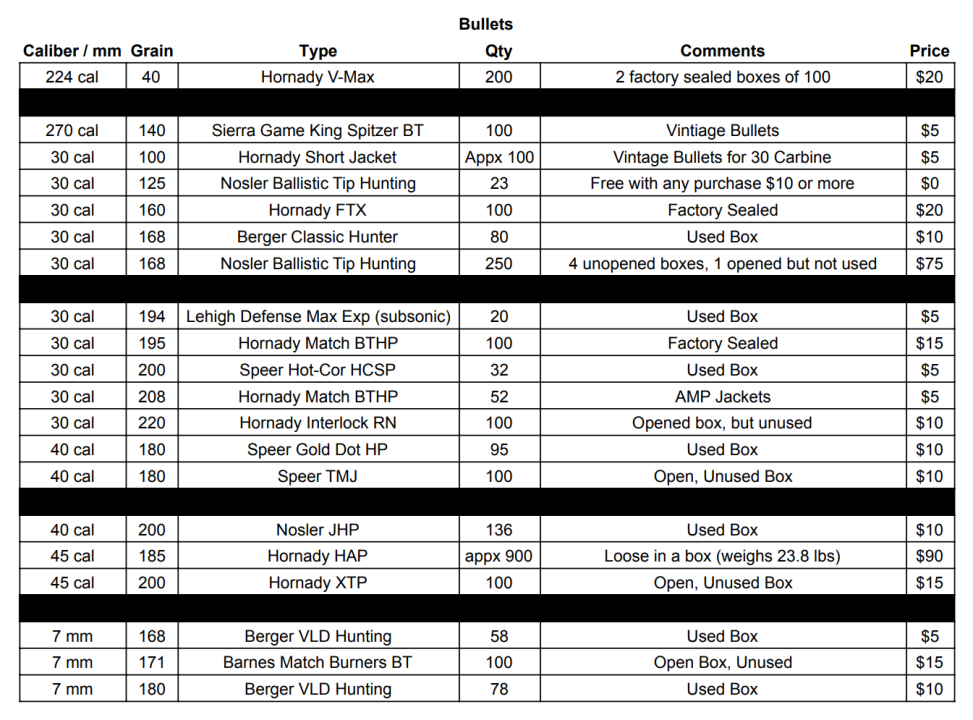 I am downsizing my reloading supplies, surplus optics & ammo, & other miscellaneous stuff. I have attached screen shots of the spreadsheet itemizing everything. If you would like the list emailed to you, send me your email address or I can share the live list through google if you have gmail.