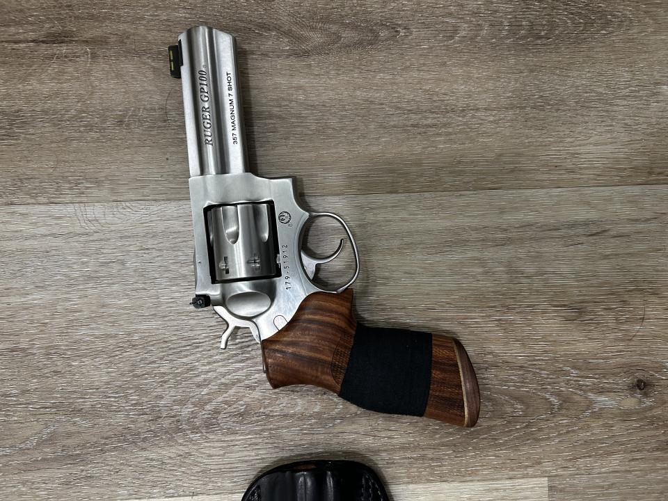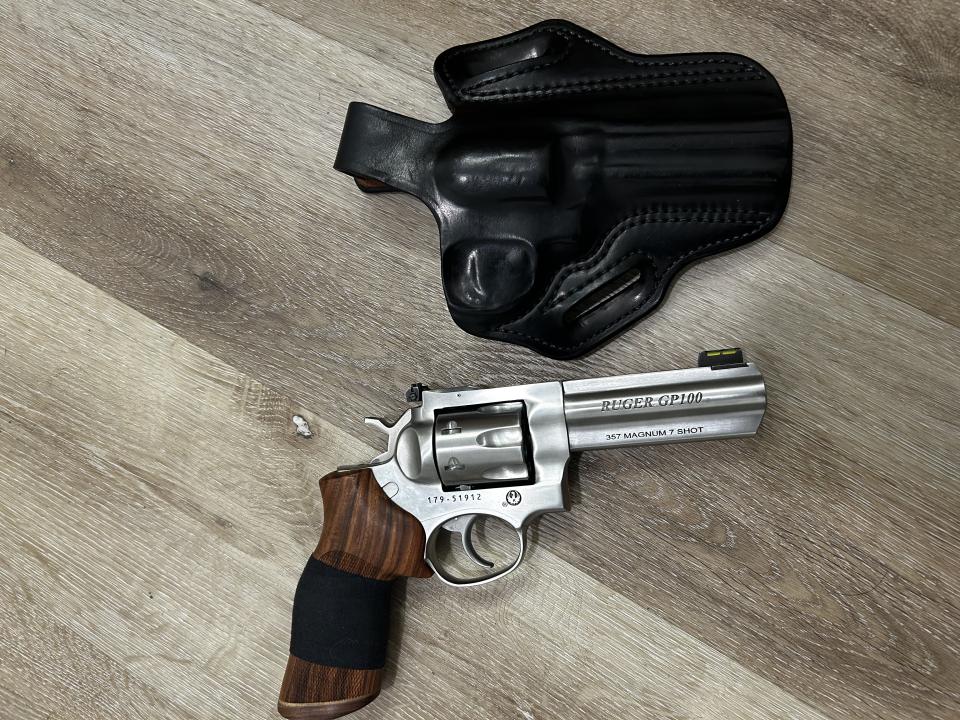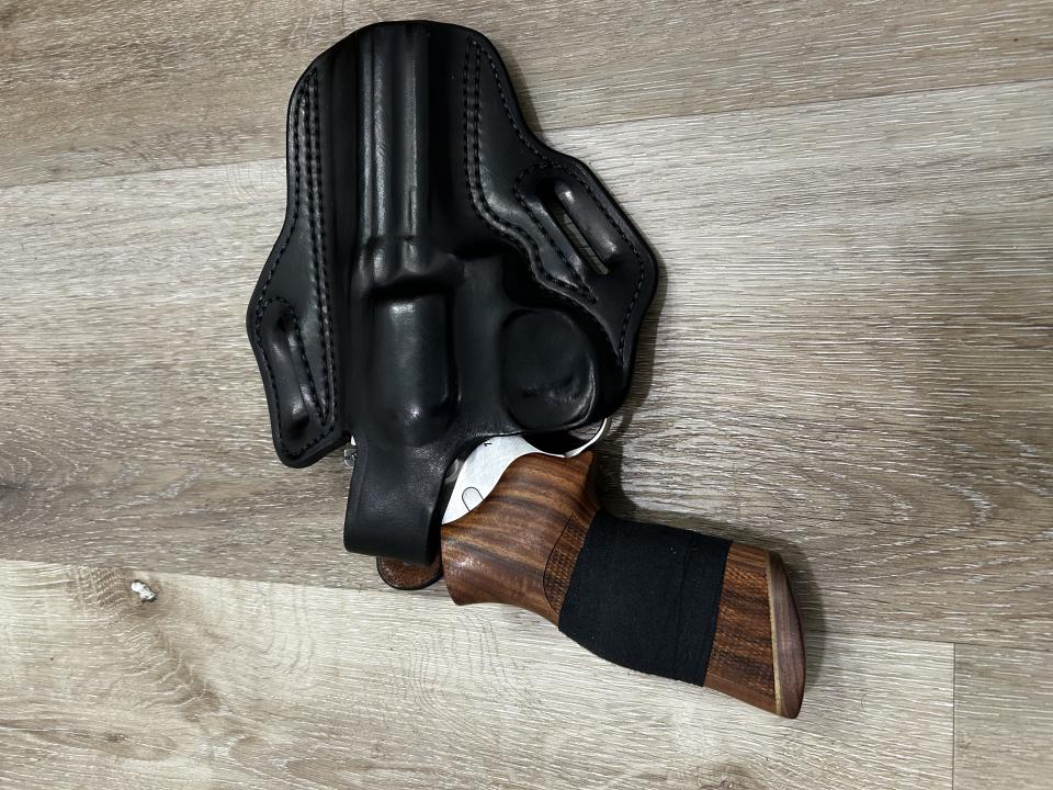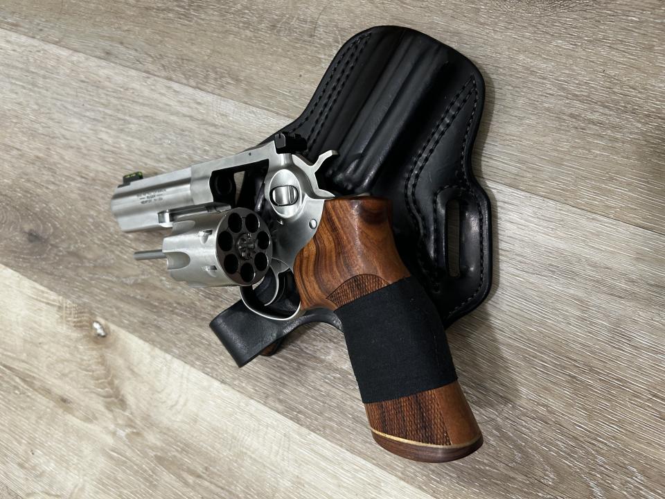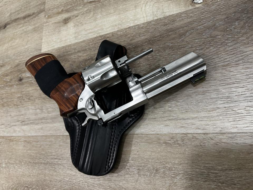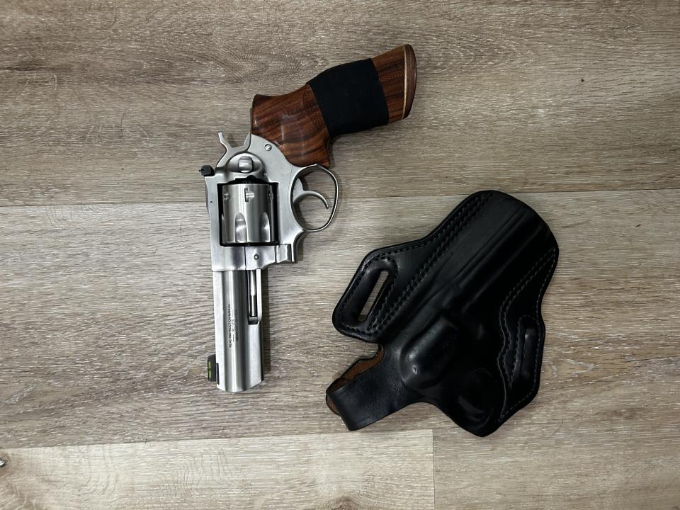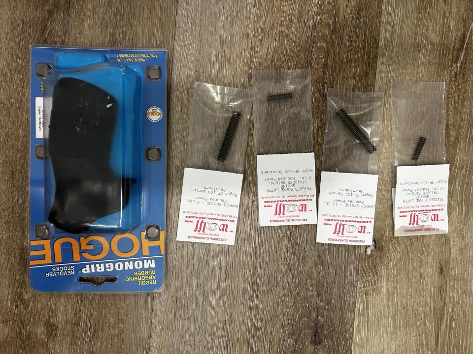 4.20" barrel. 7 shot. Black rubber Hogue grip. Hogue wood grips. 10 lbs trigger spring installed. Wolff Gunsprings 8 lbs trigger spring included. Stock 14