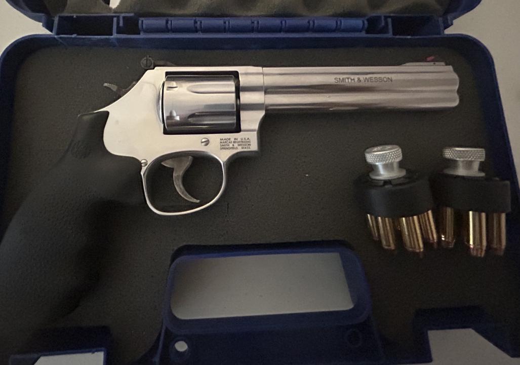 Very nice Smith 6" barrel 686 plus .357 Magnum 7-shot with 2 speed loaders and factory case. Very few rounds put through it. Lockup is tight and overall gun looks great. I'm looking to trade for a Smith 357 in small barrel length due to needs have changed due to injury. I'd prefer trade rather than selling but will sell for the right offer.