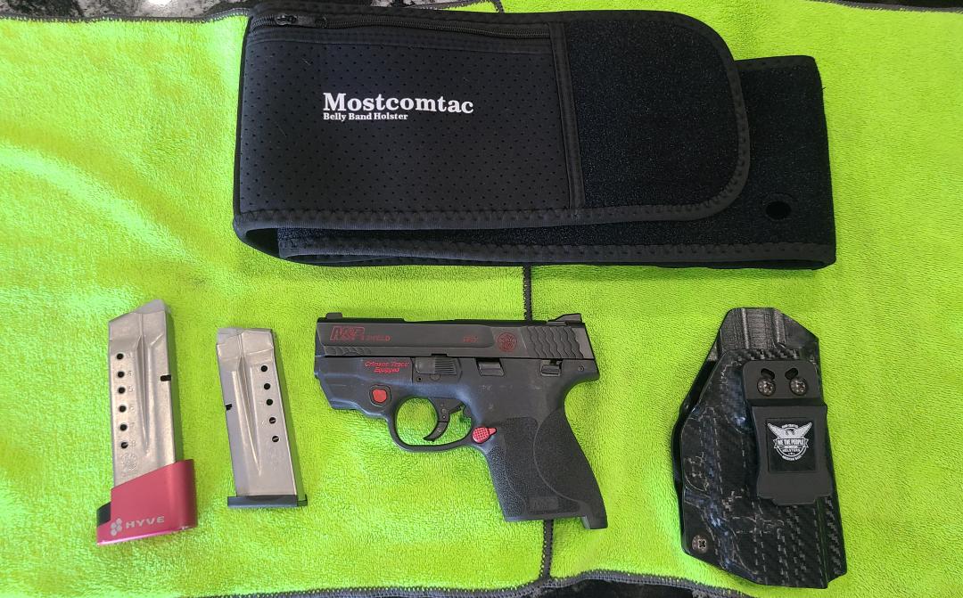 Comes with a "We the People" belt holster as well as a belly band holster that carries the pistol, 2 magazines, and has an extra storage pocket.