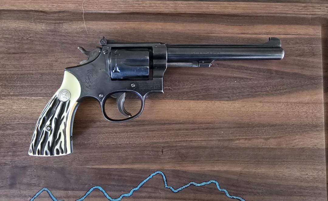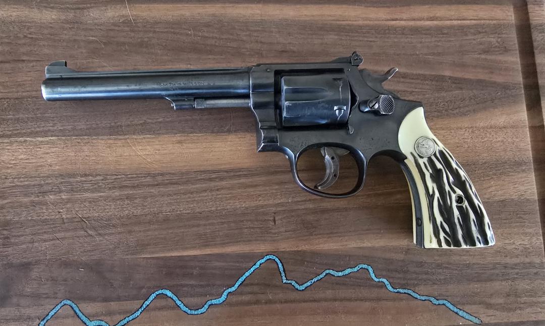 This is the rare 5 screw model. (Look it up). Last of the hand fitted extremely well made Smiths. This was made in 1947. It has the wider target trigger, after market Franzite grips, (from 60's). Very accurate! It has slight pitting and normal holster wear. Asking $750