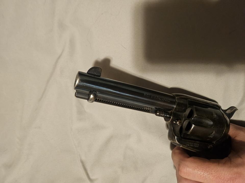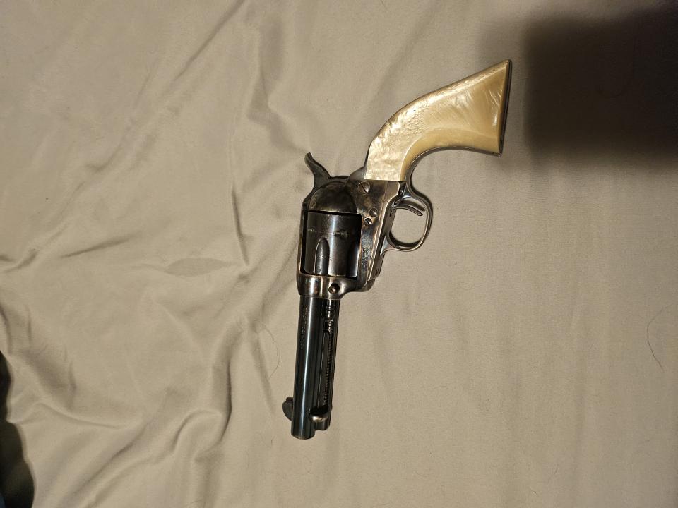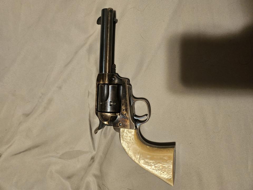 Uberti 45 long colt with the blue barrel and cylinder with pearl grips! Has the standard 5.5 inch barrel. Iv had this pistol for 16 years and maybe put 100 rounds through it. I have another 45 that I like better so just never shoot this one. No trades unless its a PSA rock compact 5.7x28. Feel free to message with any questions or offers.