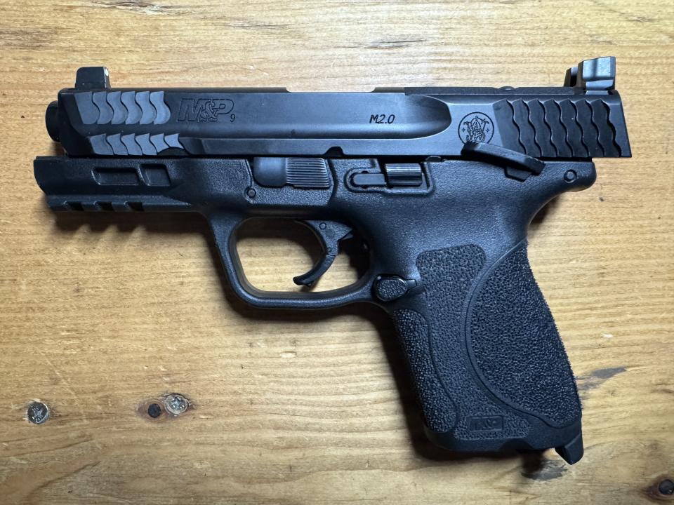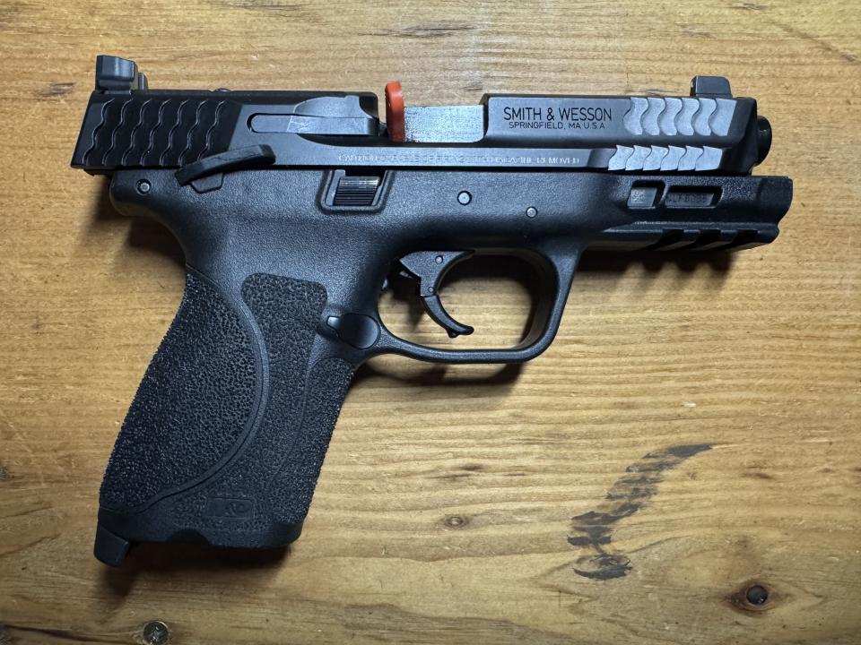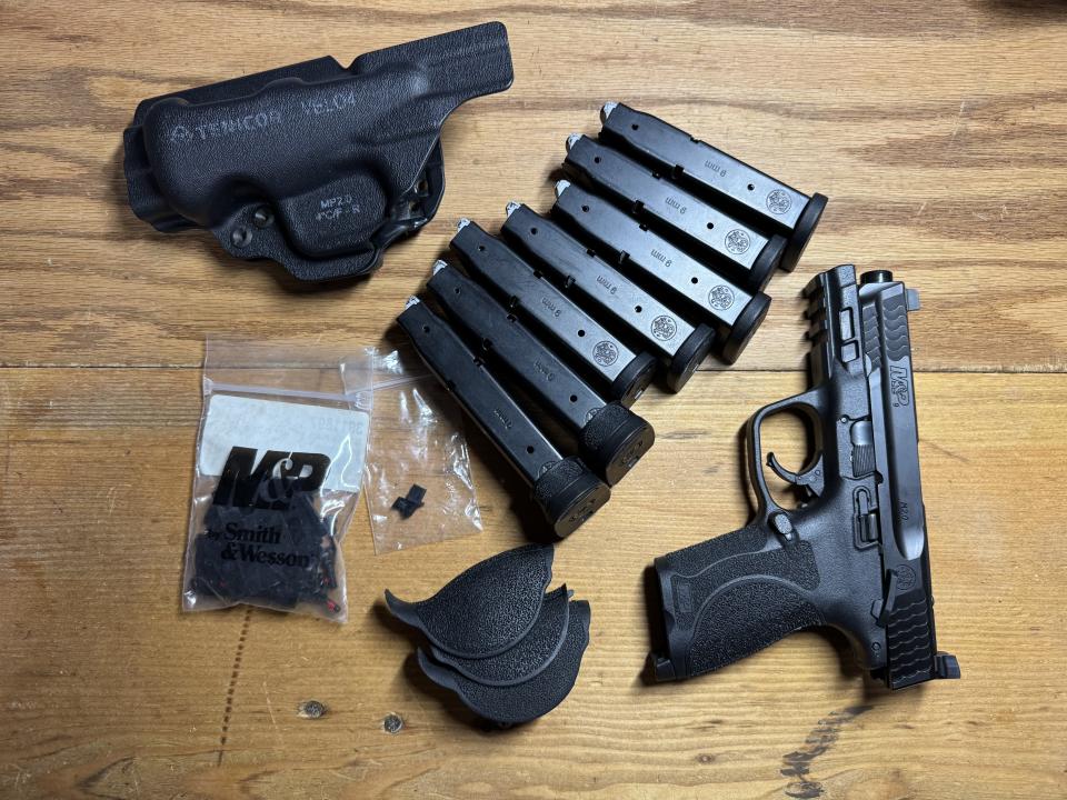 Manual safety optics ready model with the tall sights. Includes the frame plugs to remove the manual safeties. Recently serviced by Smith & Wesson who put a new slide on the gun after an optic screw sheared, sub 100 rounds on the gun after service. Includes a Tenicor Velo 4 AIWB holster, 2 17 round mags with finger extensions and 5 15 round compact mags.