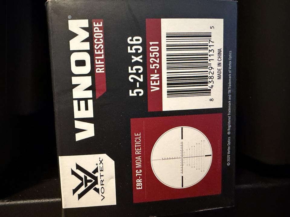 Vortex Venom 5-25x in MOA with vortex pro series rings. Has some cosmetic dings from use on my hunting rifles but functions great.