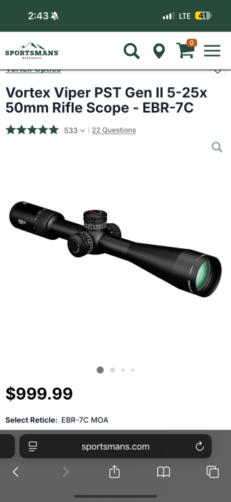 Hunting Accessories 5-25x50 viper pst gen 2 in MOA. Going for close to 900 on amazon after tax Scope is great but just wanting to downsize 800 obo Log in or register to post comments