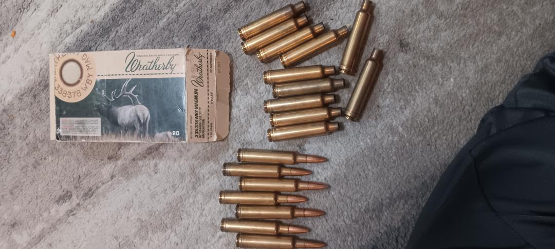 Ammo & Reloading Weatherby 338-378 Wby Mag ammo. Partial box of 7 loaded, factory, and 11 once shot brass. 40 Log in or register to post comments