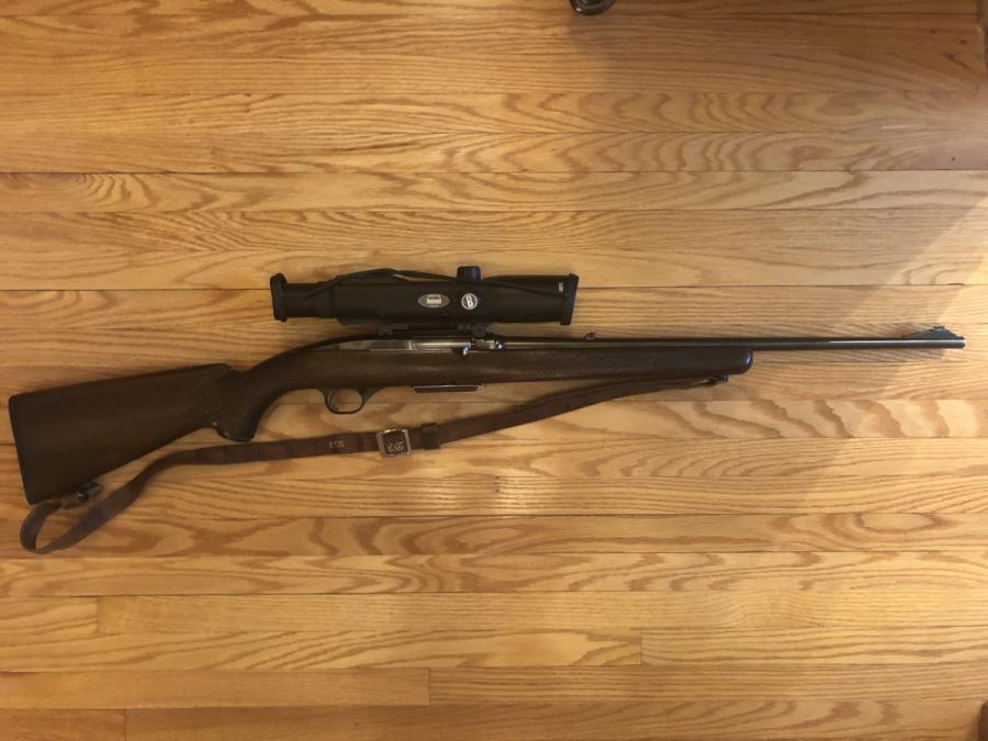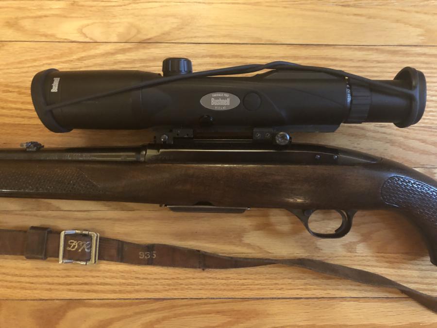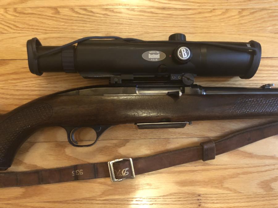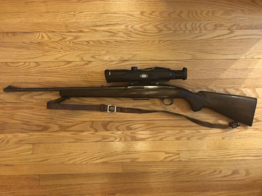 Hi. I am selling an awesome Winchester 100 semi auto 308. It is in very good condition and has a beautiful dark wood stock. It has fold down sights and a removable magazine. The sling is a nice vintage D&R 935 leather piece. I can add a rare Bushnell 4-12x42 Laser Rangefinder Riflescope