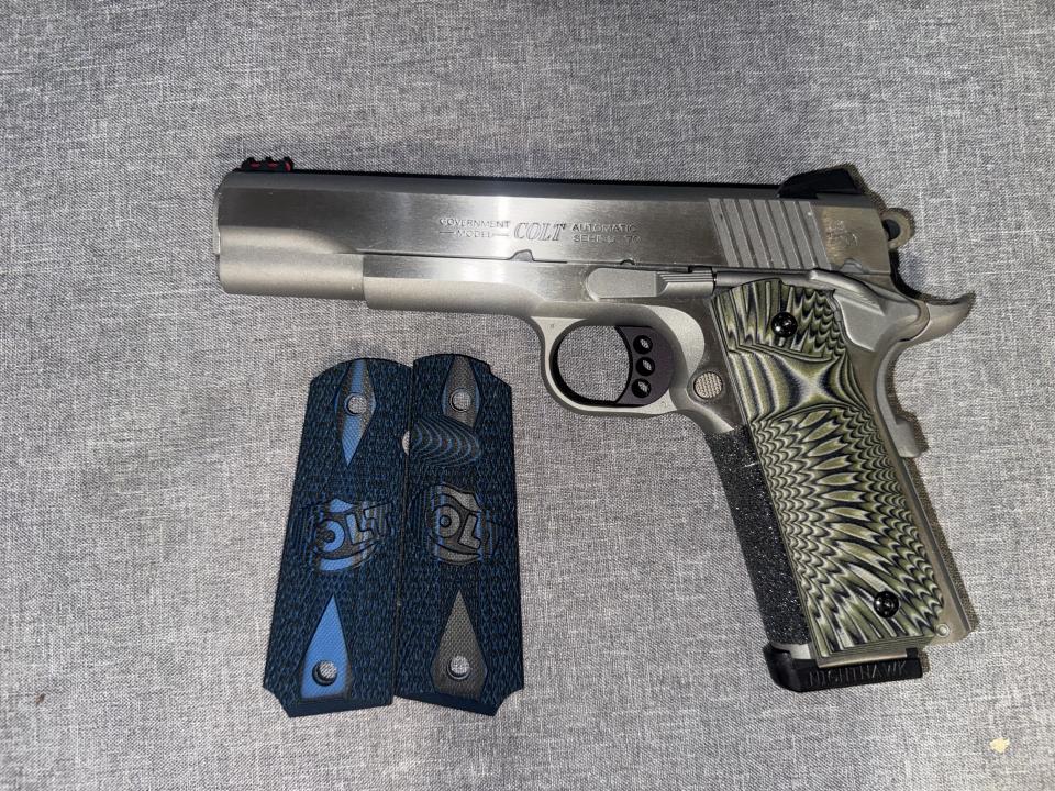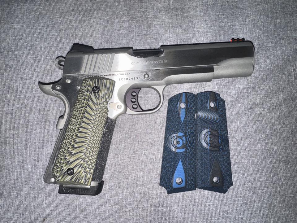 Will come with the Original blue and black G10 Colt grips and hardware. Also the original box/case and paperwork and a Nighthawk Mag.