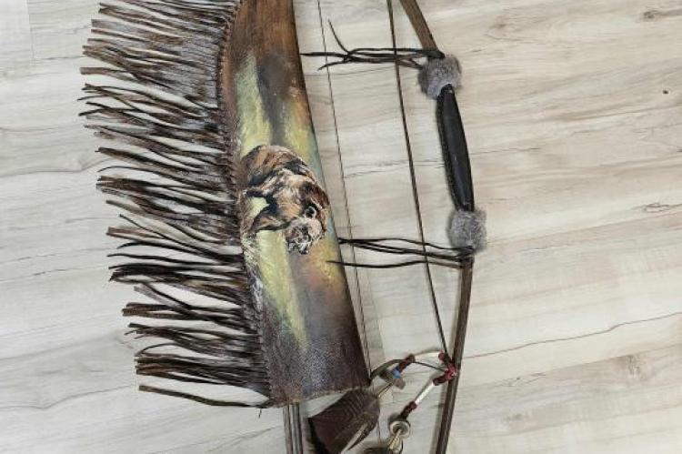 47 inch long hand made native bow with quiver and 2 arrows.