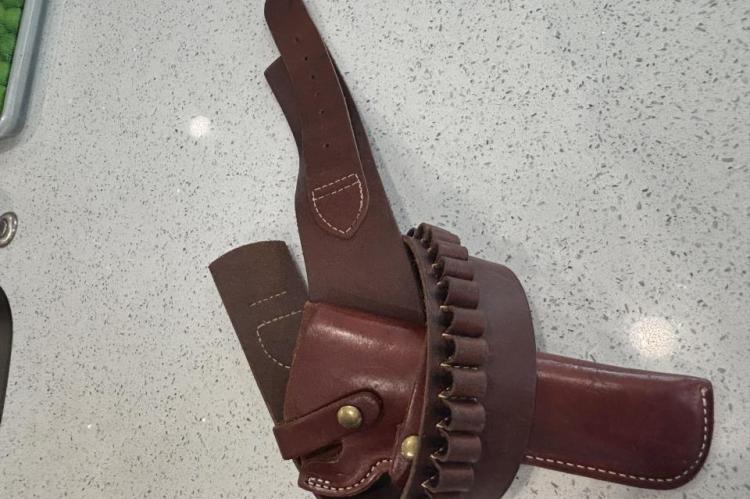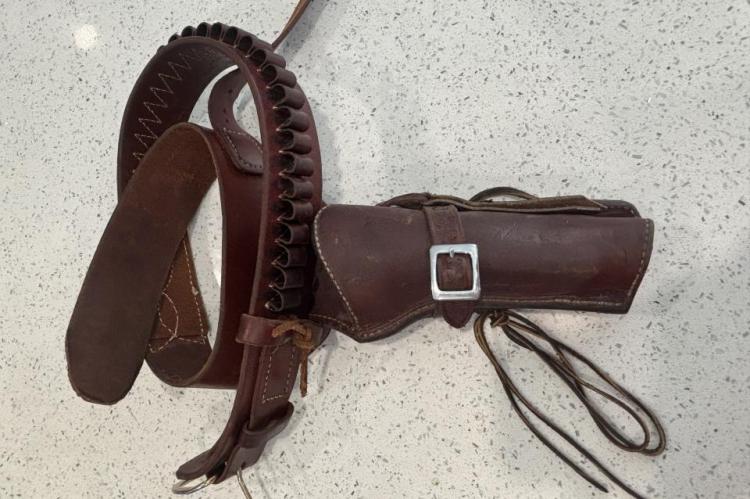 Western style gun belt with a rh Trple K holster for a 5-1/2” single action revolver. Bullet loops