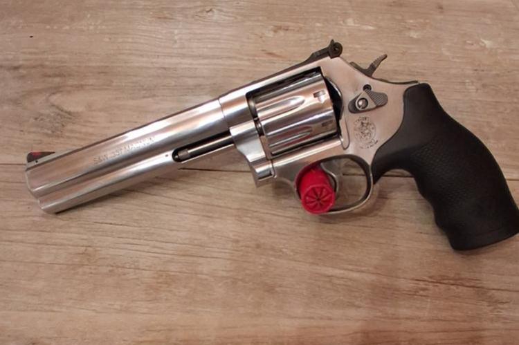 Never fired in the box 7 shot 357 mag revover with a 6 inch barrel and Bianchi leather holster