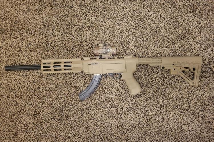 Ruger 10/22 with archangel stock and green mountain fluted bull barrel. Comes with magazine and red