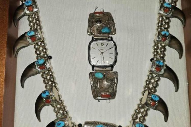 Bear claw sterling silver Navajo squash blossom necklace and watch